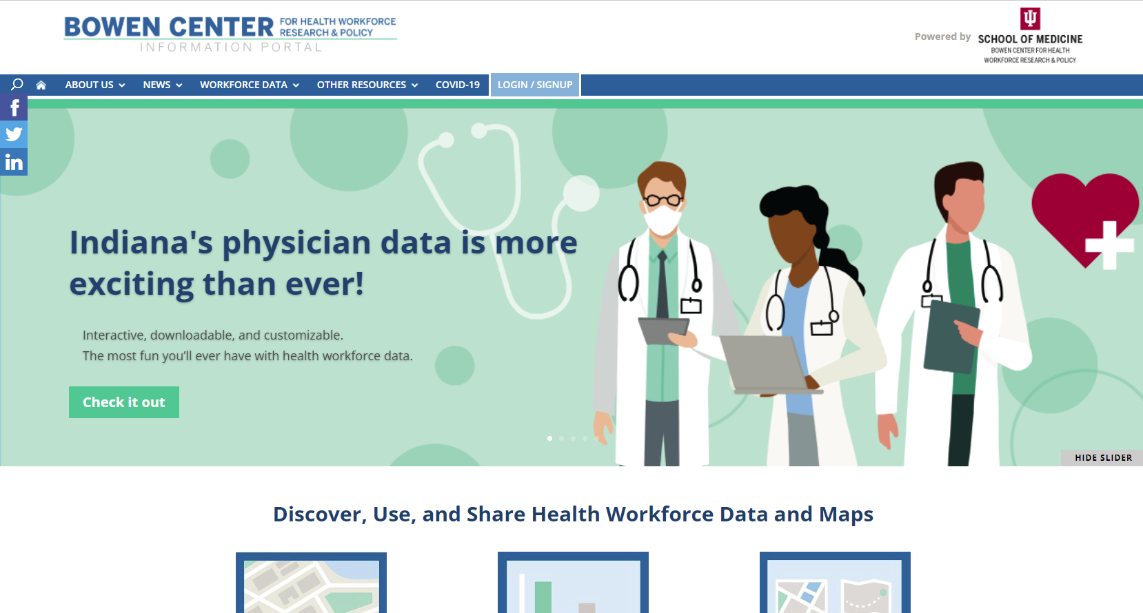 The Polis Center, in partnership with Bowen and the IU School of Medicine Department of Biostatistics, developed an online information sharing and mapping platform for Bowen that allows users the flexibility of accessing their information offsite and readily discover, map, and share health workforce data, including data about Indiana’s workforce supply and distribution, shortages, and education pipeline. These processes and tools enable Bowen staff to take the primary role in developing the map content to be presented within their portal.