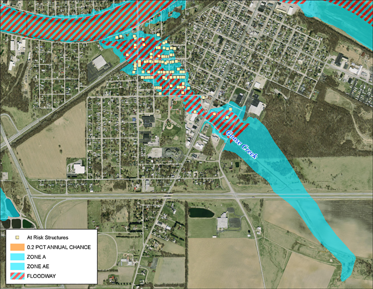 The City of Logansport endured recurring flooding issues, with the greatest concern being the concentration of structures within the flood boundary along Goose Creek. After engaging with community officials, it was determined that focusing efforts on Goose Creek would provide the greatest mitigation impact for the city. The current effective flood boundaries along Goose Creek encompassed about 90 structures with an assessed value of more than $3.6 million. The impact of the special flood hazard areas (SFHA) of the Eel and Wabash Rivers as well as Goose Creek was modeled along with multiple mitigation scenarios.