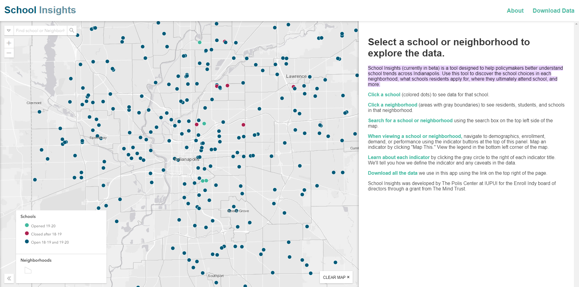 Indianapolis has one of the most diverse school choice landscapes in the country. This makes it difficult to evaluate the need for school capacity in neighborhoods. Using data from Indianapolis’ unified enrollment system, Polis built a web app designed to help policymakers better understand school trends across Indianapolis. It shows school demand, quality, and demographics alongside neighborhood data to guide decisions about where to approve new charter schools.